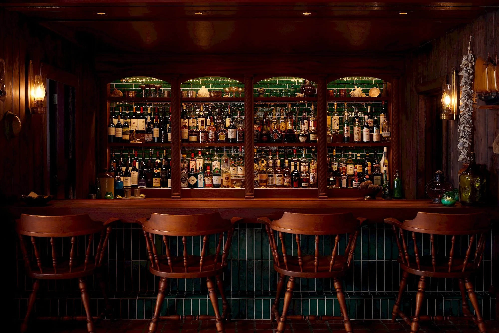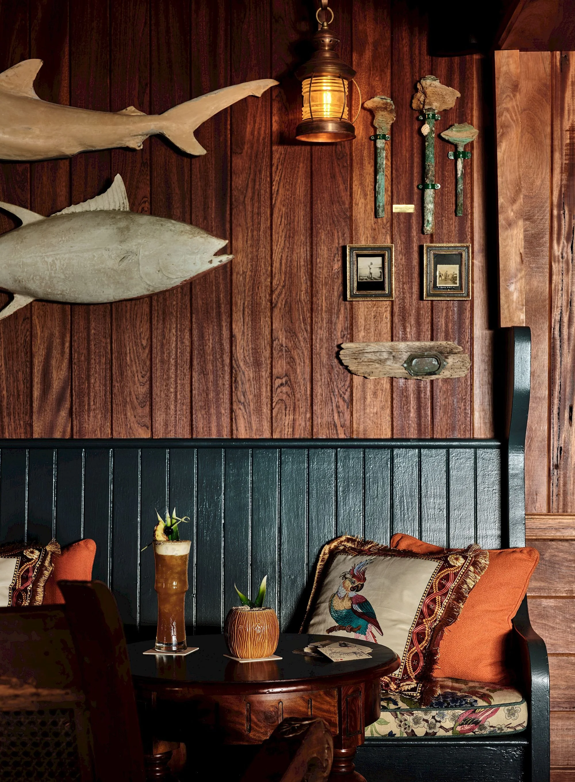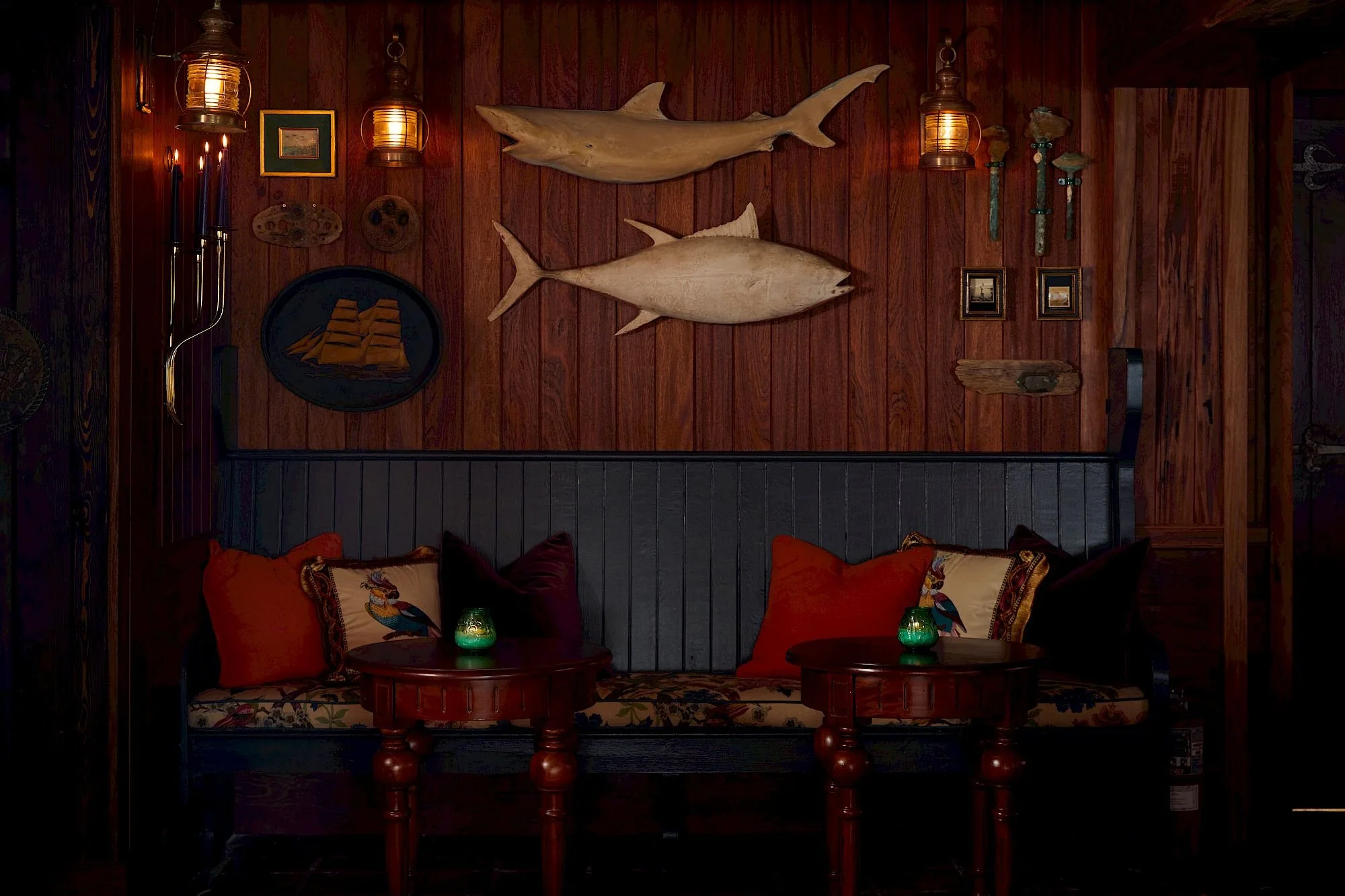 Sunken Harbor Club is a dockside tavern and tropical cocktail bar at Cambridge Beaches resort overlooking Mangrove Bay.